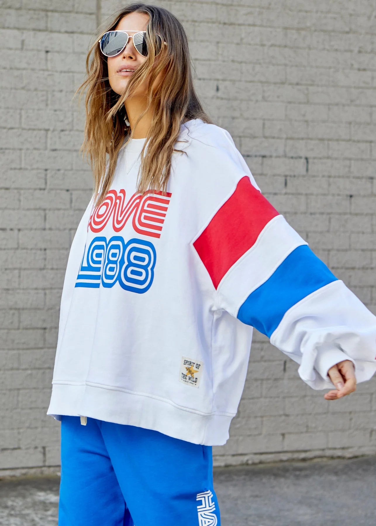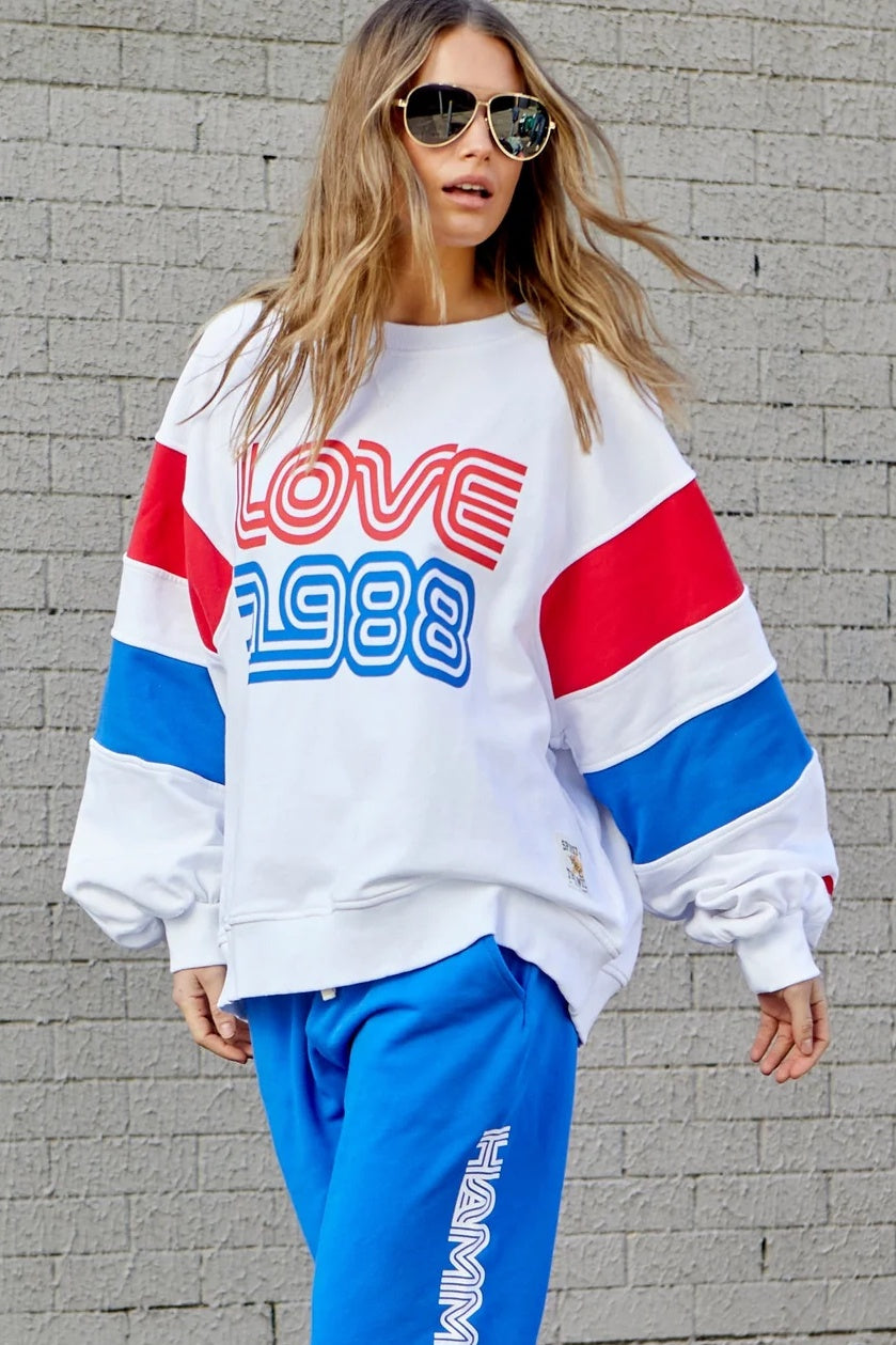 The crisp white base pops with a multi-coloured LOVE 1988 front print, while the subtle puff sleeve adds a touch of softness to the sporty silhouette.