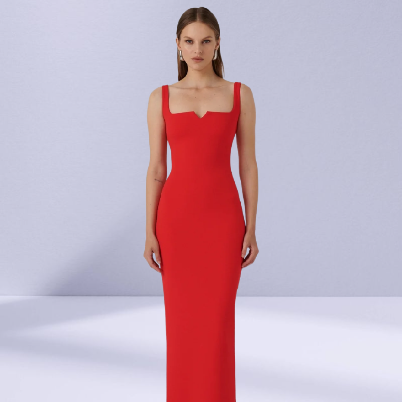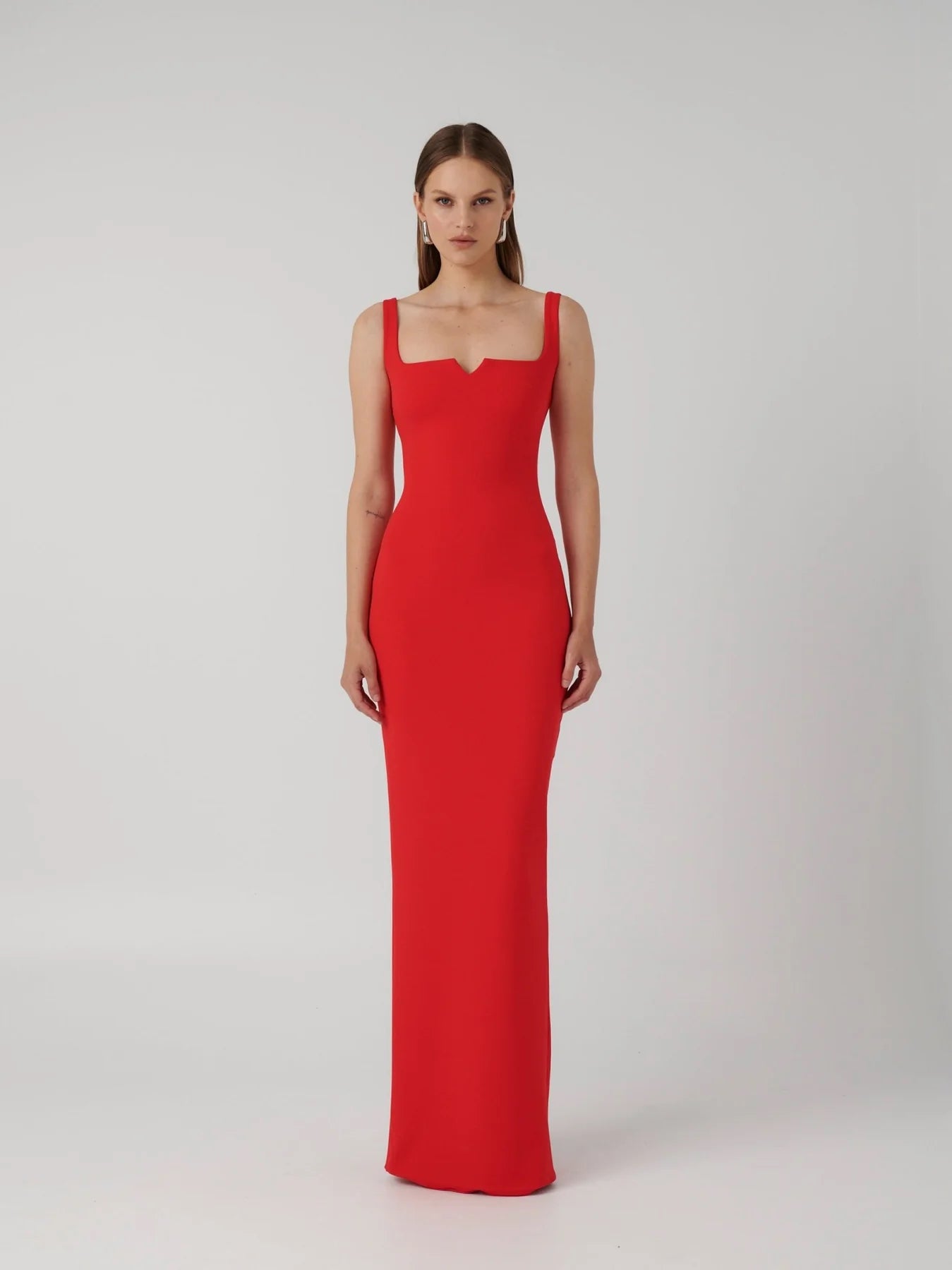 The sculpted dress is made from a lustrous Cherry red stretch crepe with a dipped neckline feature. Complement the gown with a statement earring and hand held clutch.