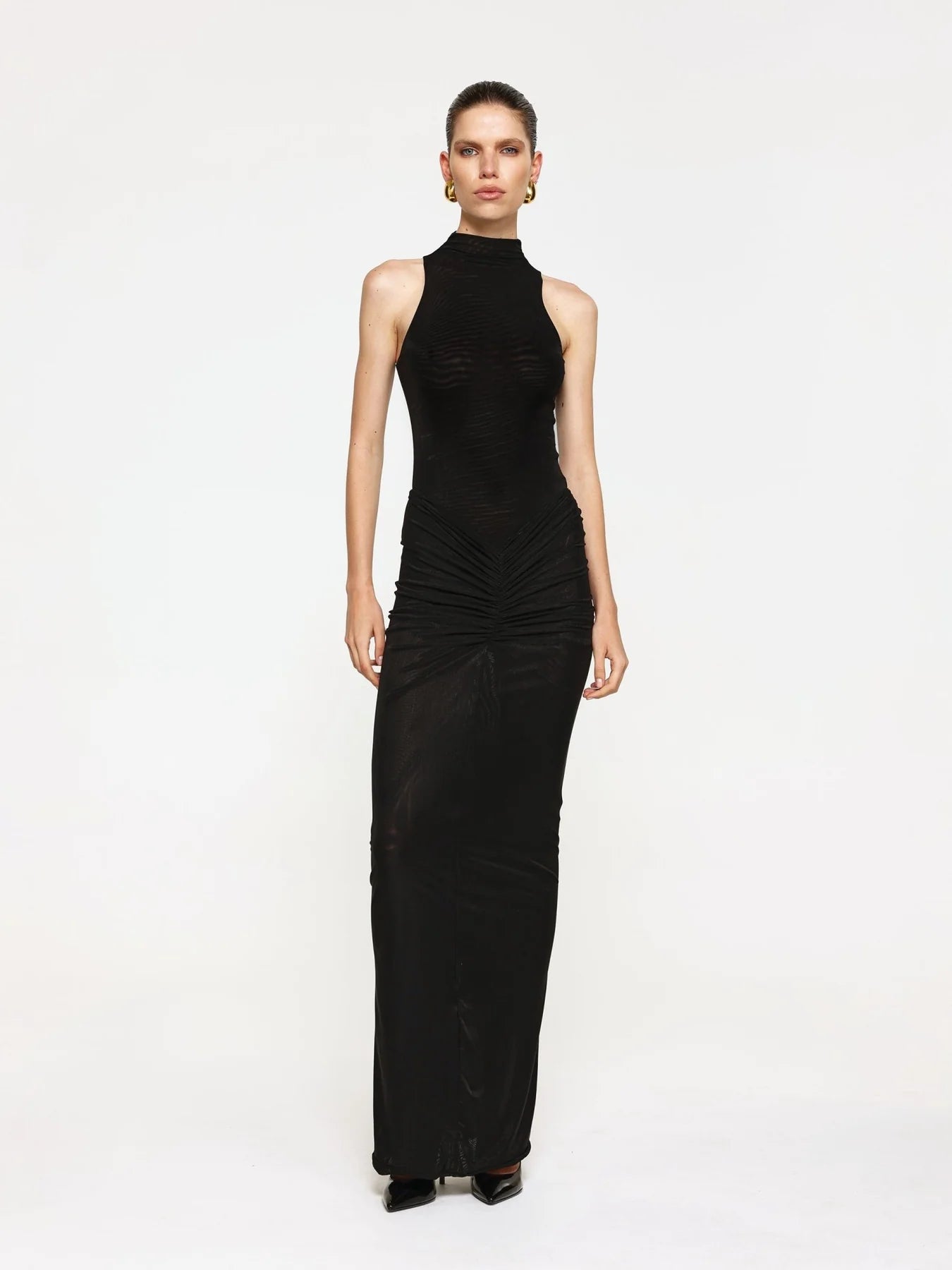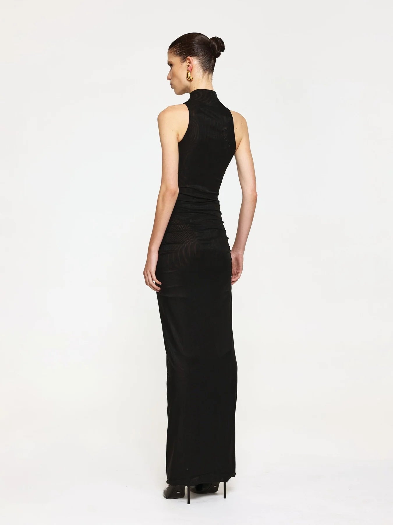The high neckline contrasts with its sheer fabrication, creating a refined yet daring silhouette. Whether worn solo for an after-dark event or layered under a blazer for contemporary edge, this bodysuit commands attention.