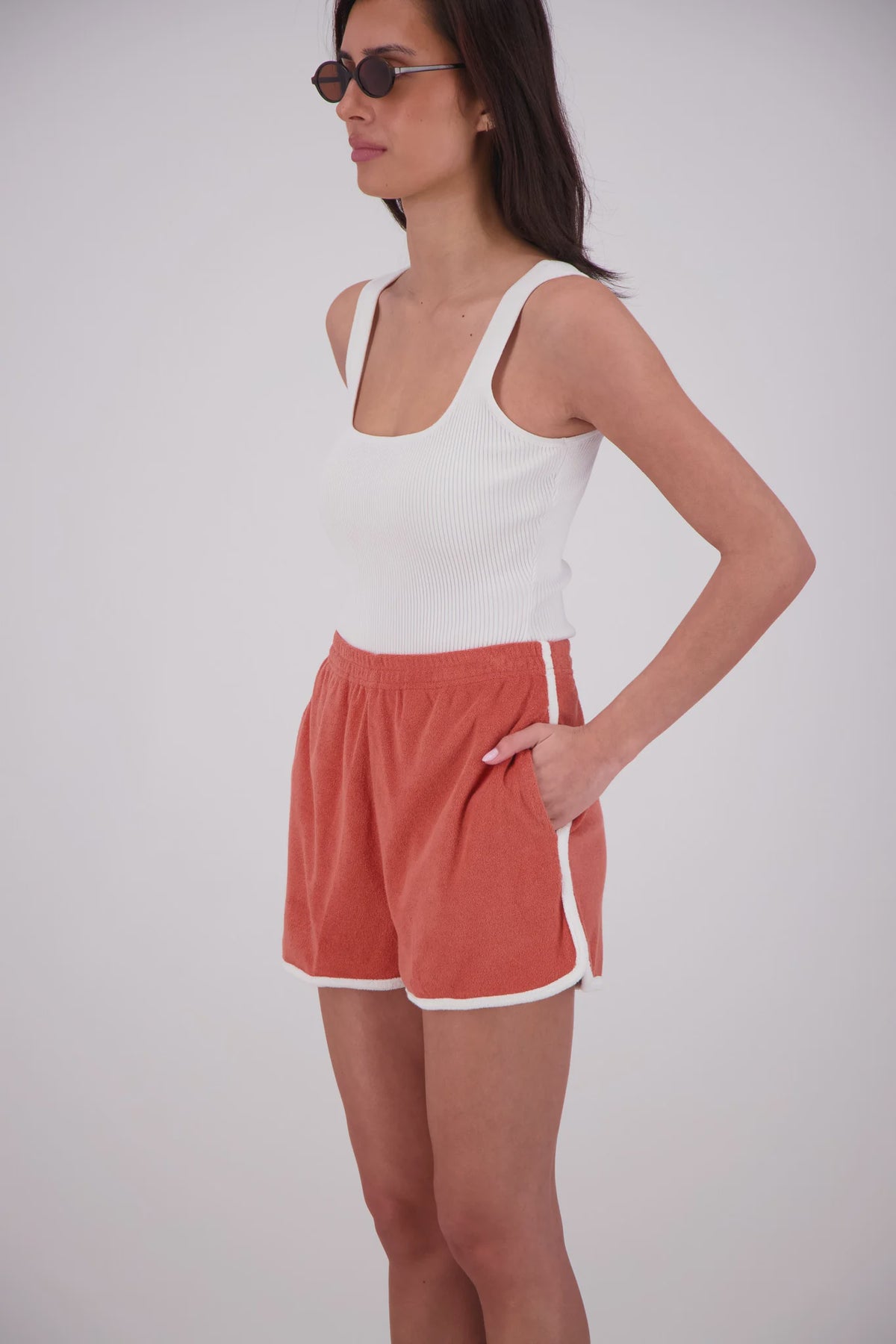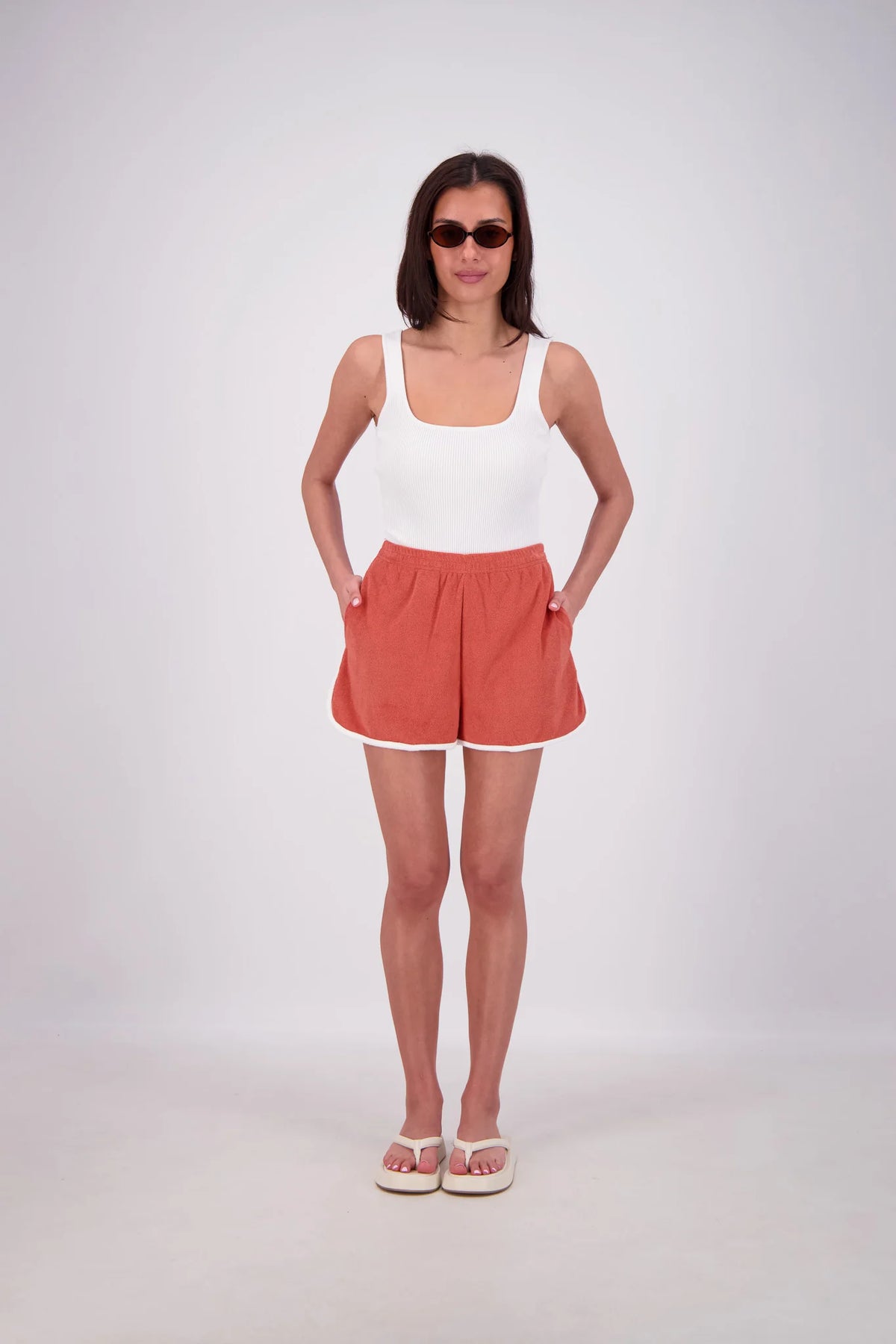 Keep it simple with a white rib tank or tee. Add slides or sneakers depending on your day. If you’re building a set, these pair perfectly with any Jasmine Alexa lounge and terry pieces.