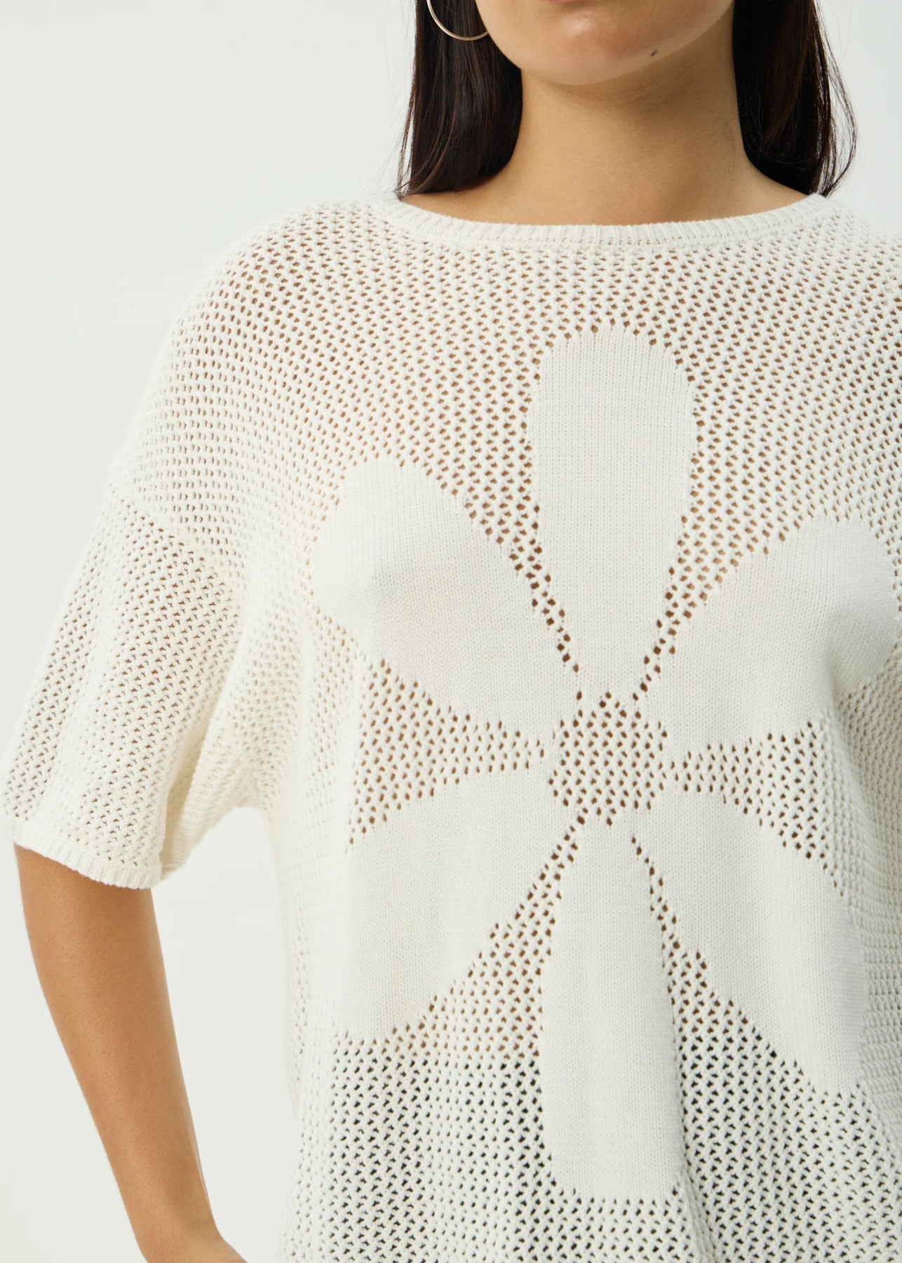 The open lace knit gives it that laid-back, beachy vibe, and the big flower jacquard artwork? Total statement without even trying.