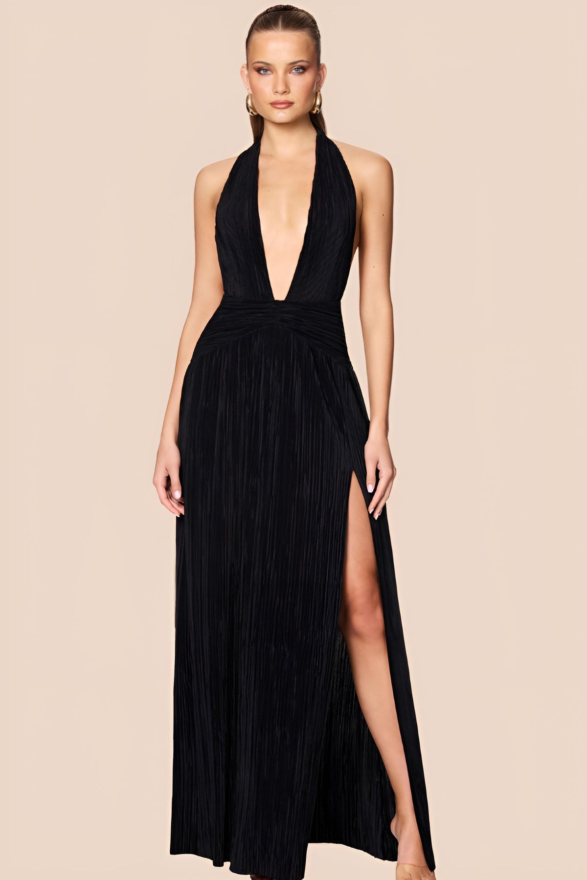 Designed and made in Sydney, this specialty-pleated halter gown gives that “modern goddess” vibe with an ultra low neckline, snatched waist, flowing maxi length and a thigh-high split for a flash of leg.