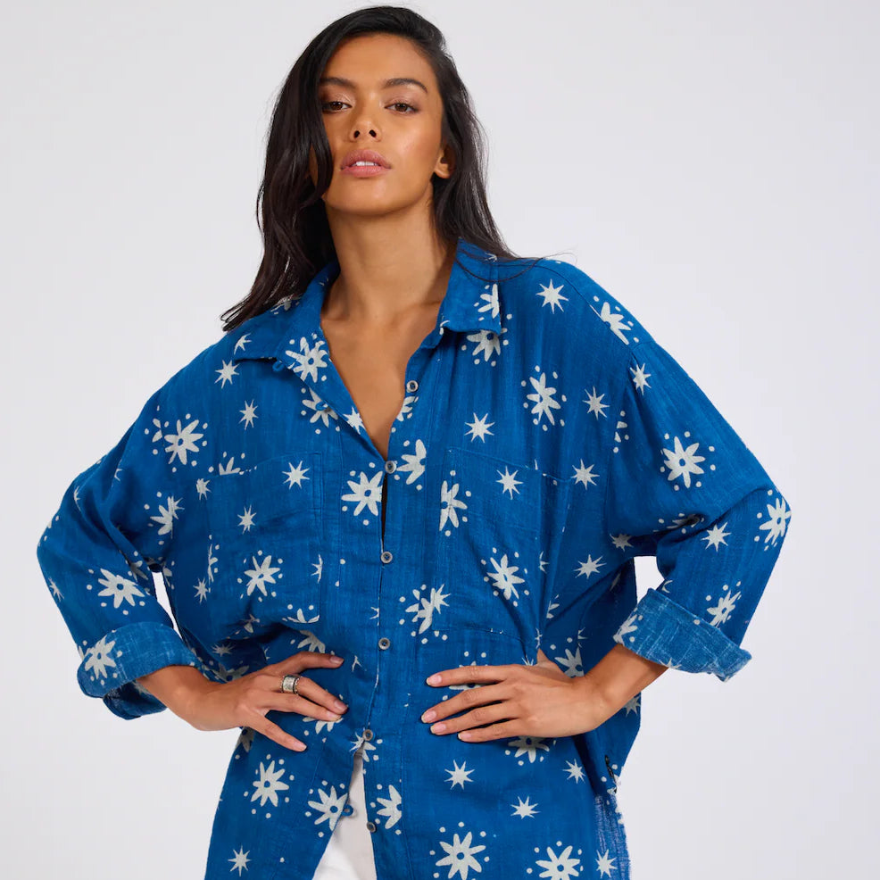 The Supernova Shirt brings that relaxed One Teaspoon attitude but in a soft, airy muslin that feels easy from the first wear. The blue base is washed in an all over star print that looks hand stamped, giving it a cool, artsy feel without trying too hard.