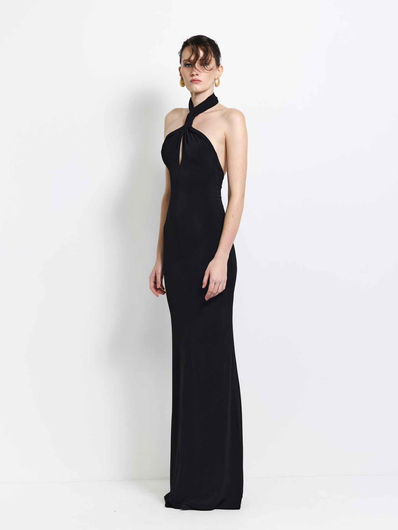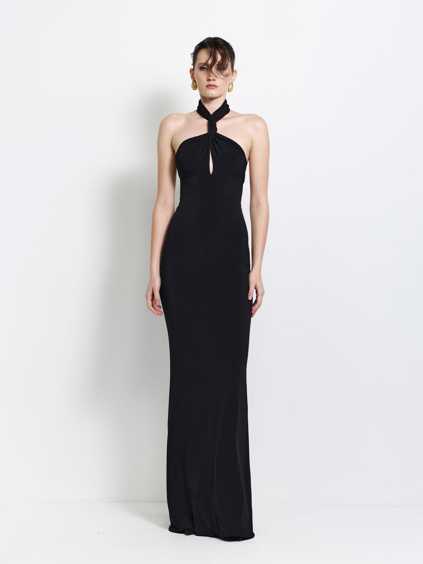 Cut from stretch jersey and fully lined, the gown sits smoothly against the body while allowing for comfortable movement. A twisted halter neckline frames the shoulders and opens to a subtle keyhole at the front, adding interest without excess. The back drops into a low open cut, balancing the otherwise minimal design and giving the gown its defining feature.