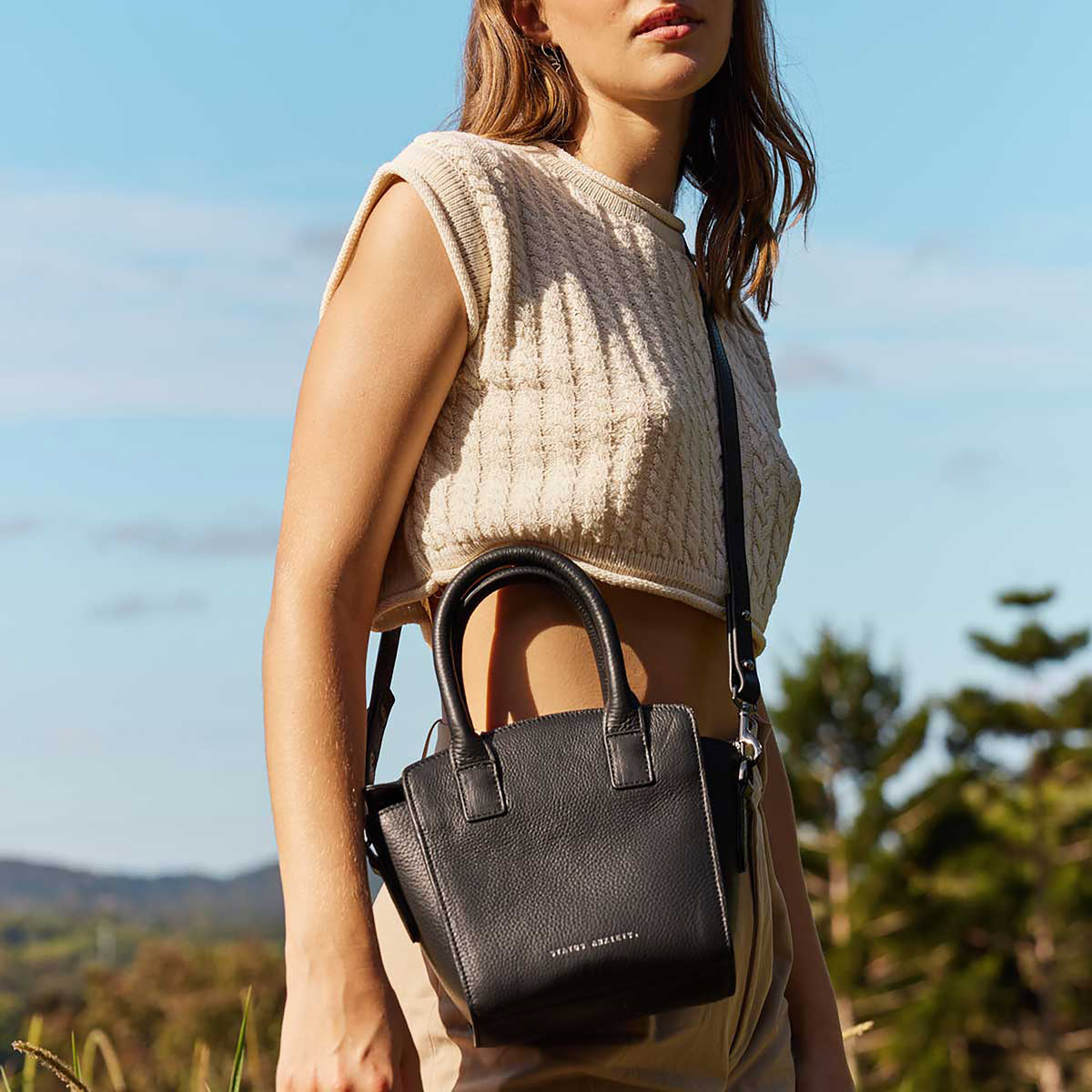 Global pandemics are so 2021. May we suggest you throw this 'Worst Behind Us' bag over the crook of your elbow/shoulder or in hand and get back to doing your thing again. With its more compact and structured shape it's perfect for transitioning from day to night.